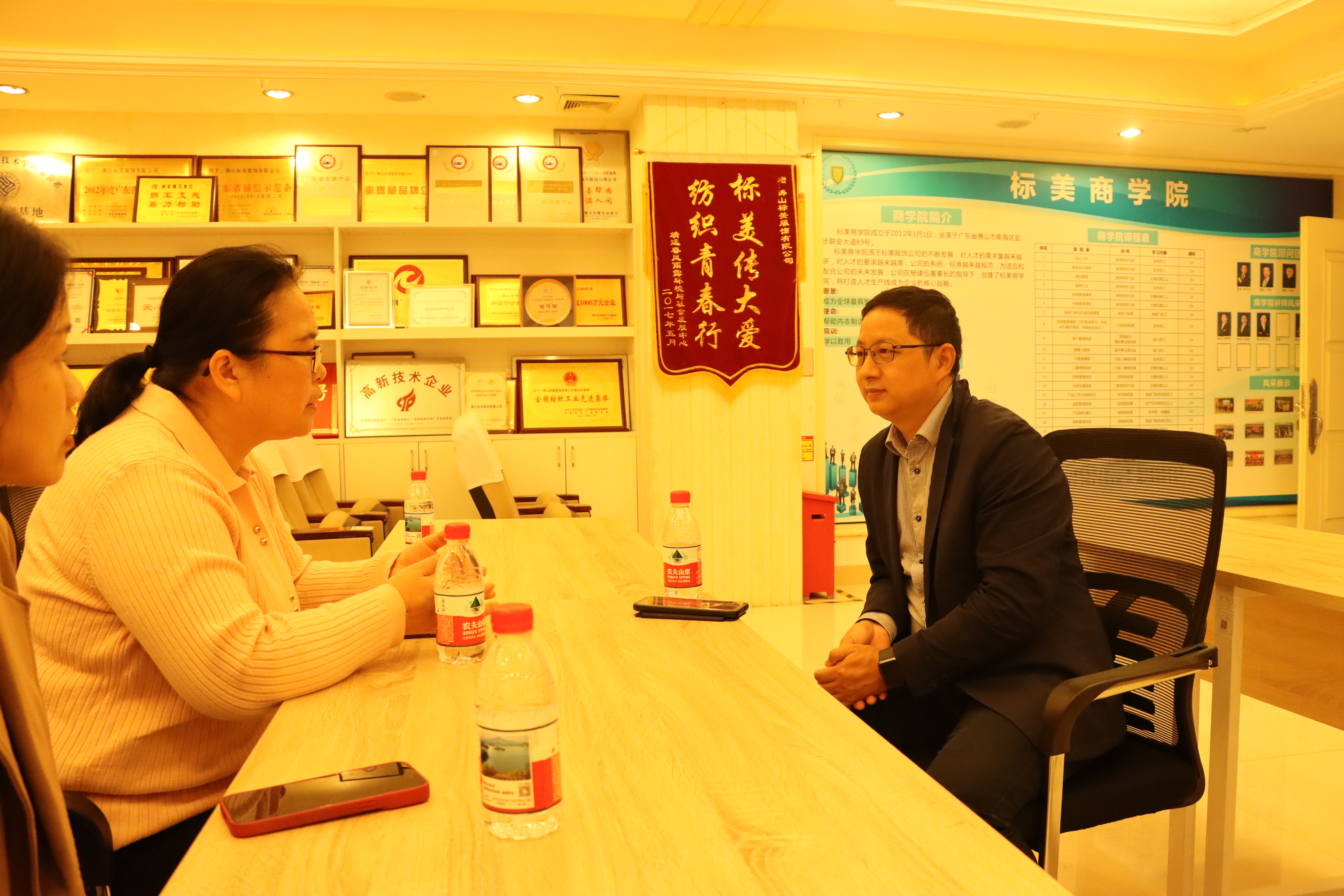 谈及社会责任,双方围绕企业担当展开深入交流。杨鹏翔表示,标美服饰始终将社会责任融入发展血脉,既坚守合规经营底线,保障员工权益、获评南海区和谐劳动关系企业,也积极投身行业扶贫、公益事业,获评纺织产业“扶贫先进单位”,同时践行绿色发展理念,通过环境管理体系认证,助力纺织产业低碳转型。张志荣秘书长对此表示认可,强调学会始终倡导会员企业践行社会责任,标美的实践为行业树立了良好典范,契合学会推动产业高质量发展的初心。